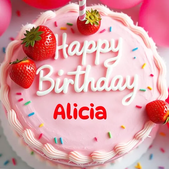 Überrasche Alicia mit dieser traumhaften rosa Geburtstagstorte! Diese wunderschöne Erdbeer-Sahne-Torte mit cremiger rosa Glasur, frischen Erdbeeren und bunten Streuseln macht jeden Geburtstag unvergesslich. Die elegante weiße ‚Happy Birthday‘ Schrift und die festliche Dekoration mit Ballons im Hintergrund schaffen die perfekte Geburtstagsatmosphäre. Lade jetzt dein personalisiertes Geburtstagstorten-Bild mit Alicia kostenlos herunter und teile süße Geburtstagswünsche! Alles Gute zum Geburtstag, Alicia!