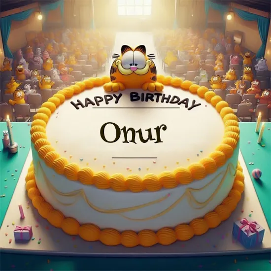 Feiere Onurs Geburtstag mit einer bezaubernden Garfield-Torte! Lade dieses personalisierte Geburtstagstorten-Bild mit Onur kostenlos herunter und teile die Freude. Glückwunsch zum Geburtstag Onur! Eine wunderschöne cremige Torte mit Garfield-Dekoration wartet auf dich. Kostenloser Download der personalisierten Geburtstagstorte mit Onur.