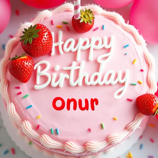 Überrasche Onur mit dieser traumhaften rosa Geburtstagstorte! Diese wunderschöne Erdbeer-Sahne-Torte mit cremiger rosa Glasur, frischen Erdbeeren und bunten Streuseln macht jeden Geburtstag unvergesslich. Die elegante weiße ‚Happy Birthday‘ Schrift und die festliche Dekoration mit Ballons im Hintergrund schaffen die perfekte Geburtstagsatmosphäre. Lade jetzt dein personalisiertes Geburtstagstorten-Bild mit Onur kostenlos herunter und teile süße Geburtstagswünsche! Alles Gute zum Geburtstag, Onur!